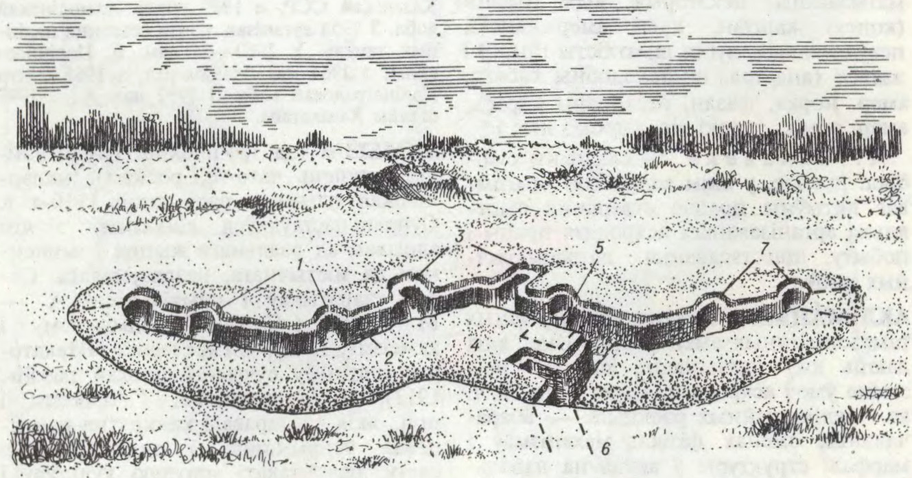 Акоп на аддзяленне: 1 — ячэйкі для стралка; 2 — ніша; 3 — пляцоўкі для кулямёта; 4 — прыбіральня; 5 — бліндаж (шчыліна); 6 — ход зносін; 7 — ячэйкі для стралка.