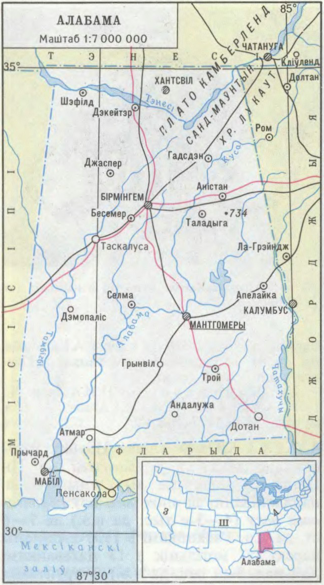штат на Пд ЗША. Пл. 131,4 тыс. км², нас. 4187 тыс. чал. (1993). Адм. ц. — г. Мантгомеры. Найб. гарады Бірмінгем, Мабіл, Хантсвіл. Большая ч. тэрыторыі занята нізіннай прыморскай раўнінай, месцамі забалочанай, на Пн і ПнУ — адгор’і Апалачаў. Клімат умерана цёплы, на Пд субтрапічны. Ападкаў каля 1500 мм за год. Рэкі Алабама, Тэнесі. Вядучая галіна эканомікі — апрацоўчая прам-сць. Развіты чорная металургія (Бірмінгем), вытв-сць алюмінію, пластмасаў, гумы, хімікатаў, тэкстылю, электратэхн. абсталявання. Прадпрыемствы цэлюлозна-папяровай, авіяракетнай, суднабуд., тэкст. прам-сці. Здабыча вугалю, нафты, прыроднага газу. ГЭС на р. Тэнесі. У сельскай гаспадарцы пераважае жывёлагадоўля (адкорм буйн. раг. жывёлы, авечак, свіней, бройлераў). Вырошчваюць сою, кукурузу, бавоўнік, сеяныя травы, арахіс, агародніну, садавіну. Чыг., аўтамаб., водны транспарт. Марскі порт Мабіл.