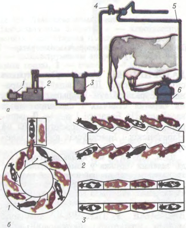 Даільная ўстаноўка: а — схема ўстаноўкі (1 — электрарухавік, 2 — вакуум-помпа, 3 — вакуумны балон, 4 — вакуумметр, 5 — вакуумправод, 6 — даільны апарат); б — пашыраныя схемы размяшчэння даільных станкоў для даільных залаў (1 — канвеернакальцавая, 2 — тыпу «Елачка», 3 — тыпу «Тандэм»).