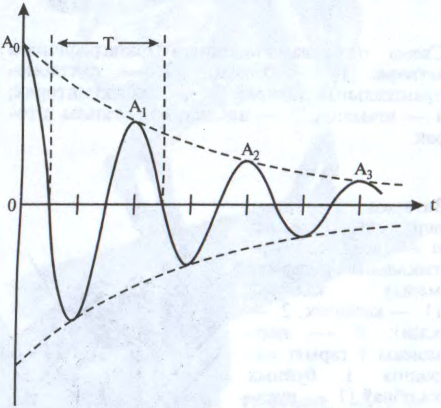 Затуханне ваганняў. A0 — першапачатковая амплітуда ваганняў; T — перыяд ваганняў.