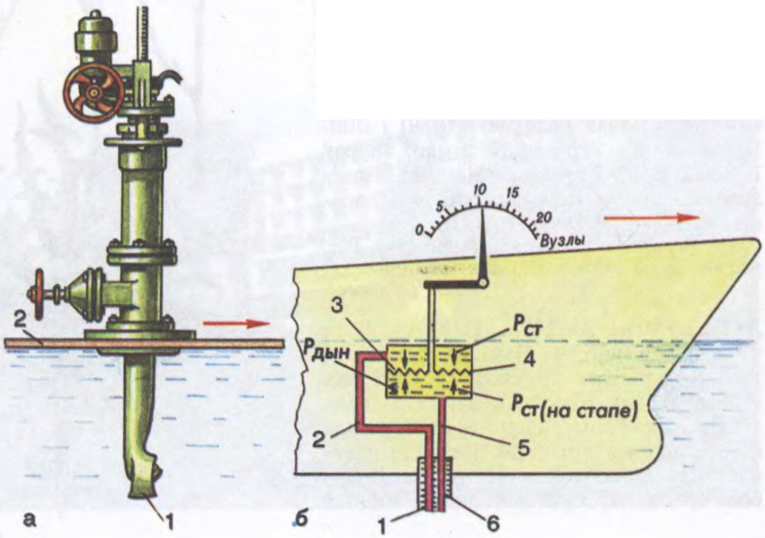 Лагі: а — механічны (1 — крыльчатка, 2 — днішча судна); б — гідрадынамічны (1, 6 — адтуліны для прыёму статычнага і сумарнага ціскаў; 2, 5 — трубаправоды статычнага і сумарнага ціскаў; 3 — дыяфрагма; 4 — сільфонны апарат; pдын, pст — дынамічны і статычны ціскі).