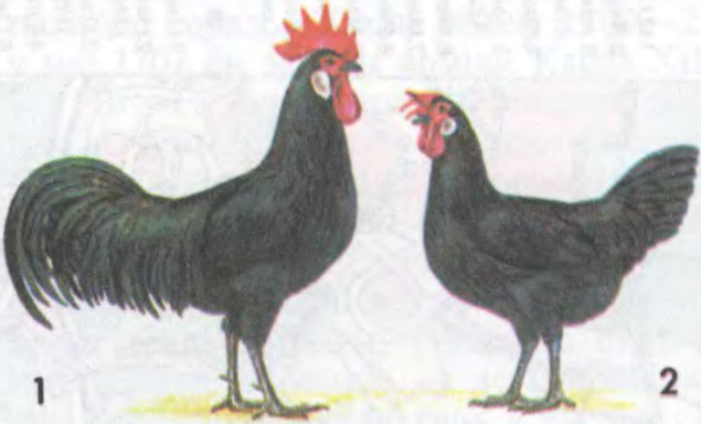 Тулава і шыя падоўжаныя, спіна прамая, грудзі шырокія, глыбокія. Галава сярэдніх памераў, грэбень ліста- (у пеўняў прамастойны) або ружападобны; вушныя мочкі белыя. Махавыя і рулявыя пёры моцна развітыя, у пеўняў коскі доўгія. Ногі высокія. У белых М. дзюба і ногі цялеснага колеру, у чорных — чорнага колеру, апярэнне бліскучае, з зялёным адлівам. Сярэдняя маса пеўняў 3—3,5 кг, курэй 2,5—3 кг. Яйцаноскасць 150—180 яец за год. Маса яйца 60—65 г.