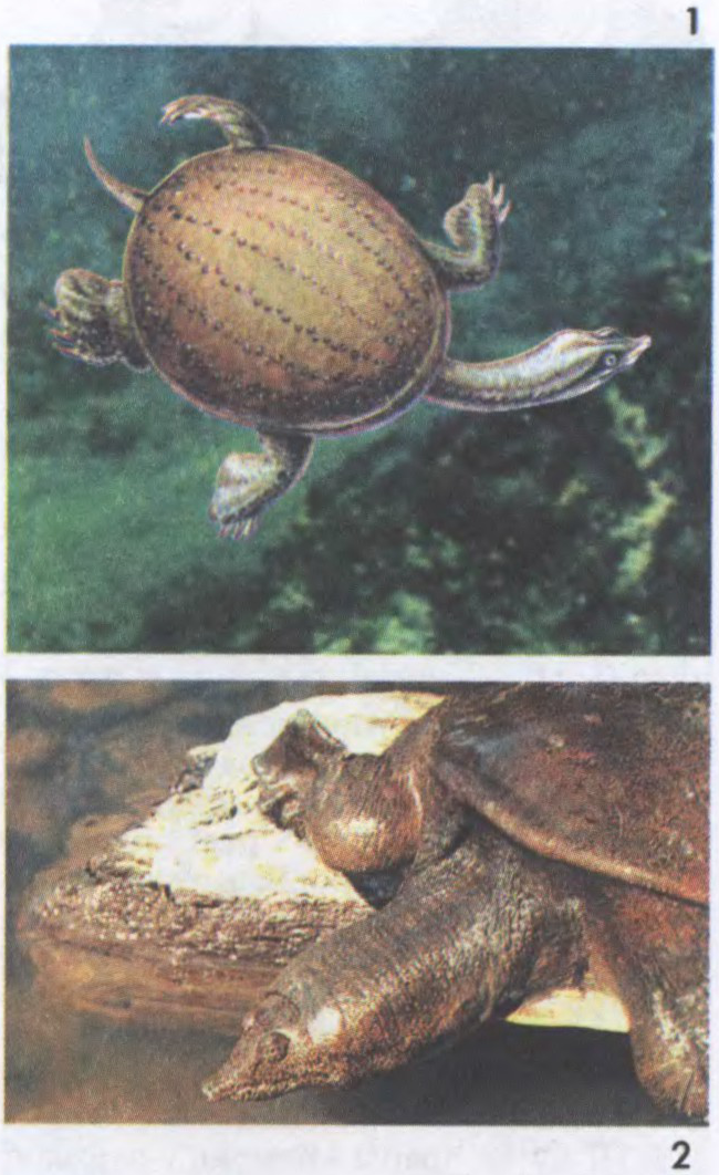 Да арт.Мяккацелыя чарапахі: 1 — трыонікс кітайскі, або далёкаўсходняя чарапаха; 2 — трыонікс калючы.