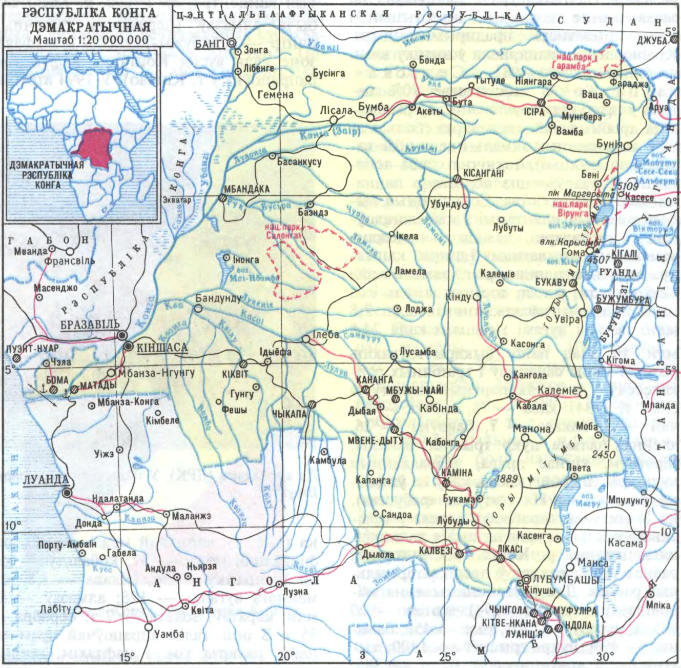 Герб і сцяг Конга (Дэмакратычная Рэспубліка Конга).Да арт.Конга (ДРК). У нацыянальным парку Вірунга.Да арт.Конга (ДРК). Сялянская хаціна ў цэнтральным раёне краіны.