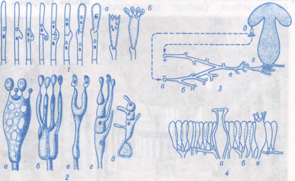 Міцэлій развіваецца ў субстраце. Гіфы шматлікія, бясколерныя або злёгку афарбаваныя, у некаторых відаў утвараюць грыбныя шнурочкі і плеўкі. Пладовыя целы разнастайнай формы (распасцёртыя, прамастойныя. булавападобныя, цыліндрычныя, разгалінаваныя, шапкападобныя з