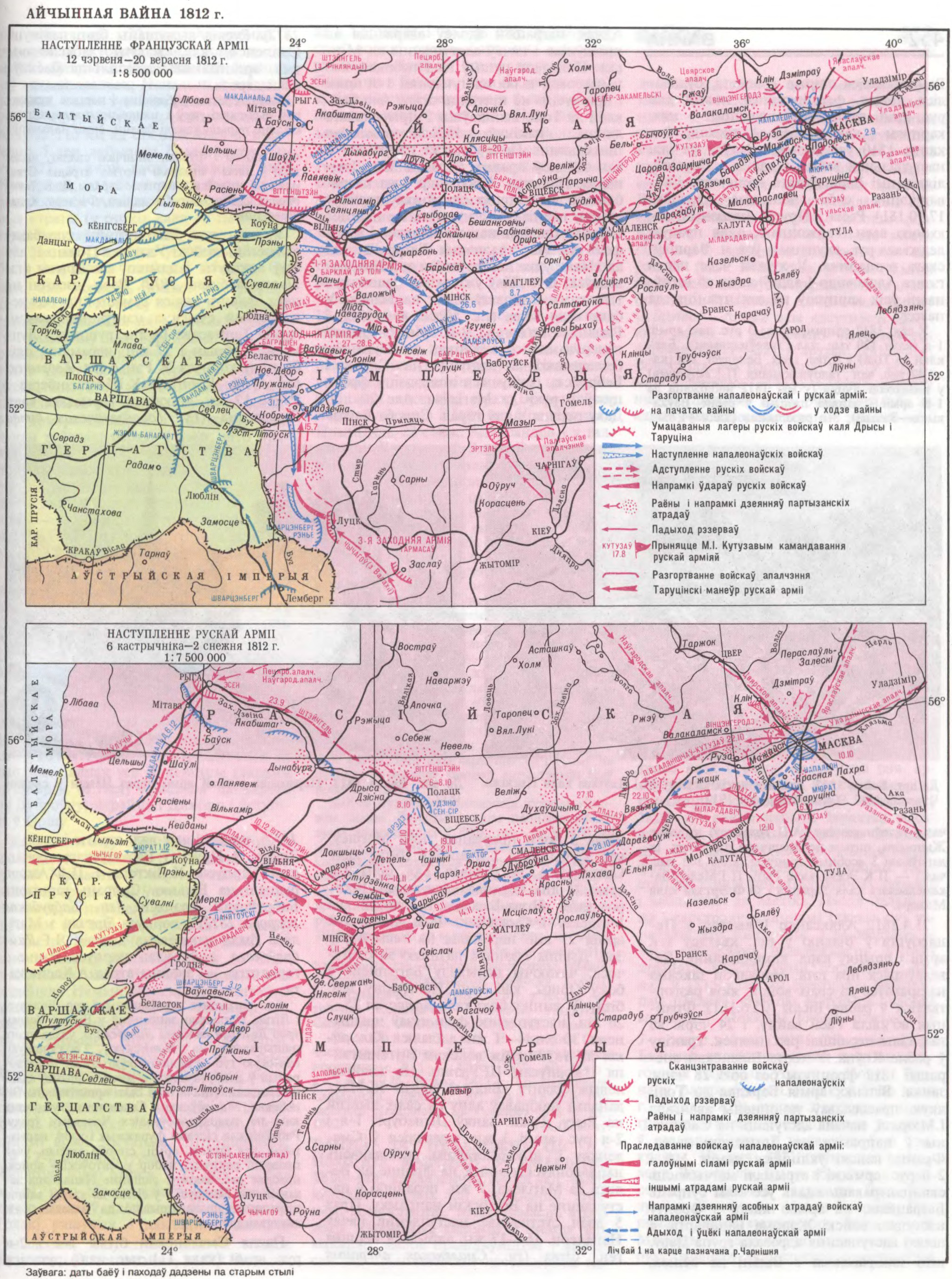 Пераканаўшыся, што заключыць мір не ўдасца, Напалеон 19 кастр. пакінуў Маскву і вырашыў адступаць па Калужскай дарозе праз багатыя паўд. губерні. Але Кутузаў бітвай пад Малаяраслаўцам 24 кастр. прымусіў Напалеона адступаць па спустошанай Смаленскай дарозе. Голад, які пачаўся ў франц. войску, гібель коней узмацніліся з вял. маразамі. Рус. армія гнала ворага, б’ючы яго з флангаў і тылу. У баях каля Краснага 16—18 ліст. французы страцілі каля 25 тыс.чал., аднак усе іх карпусы (акрамя ар’ергарда М.Нея) прабіліся па дарозе на Дуброўну, перайшлі Дняпро і ўступілі ў Оршу.