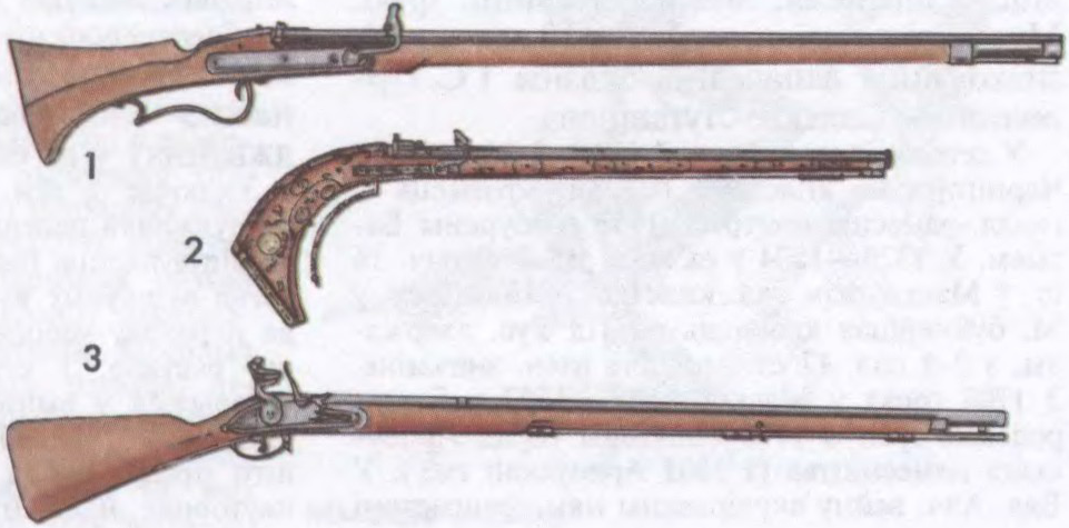 Мушкет: 1 — лёгкі аўстрыйскі з кнотавым замком. 1600; 2 — лёгкі французскі з прыкладам для ўпору ў грудзі. 1575; 3 — наразны дацкі мадэлі 1763, калібру 27 мм.