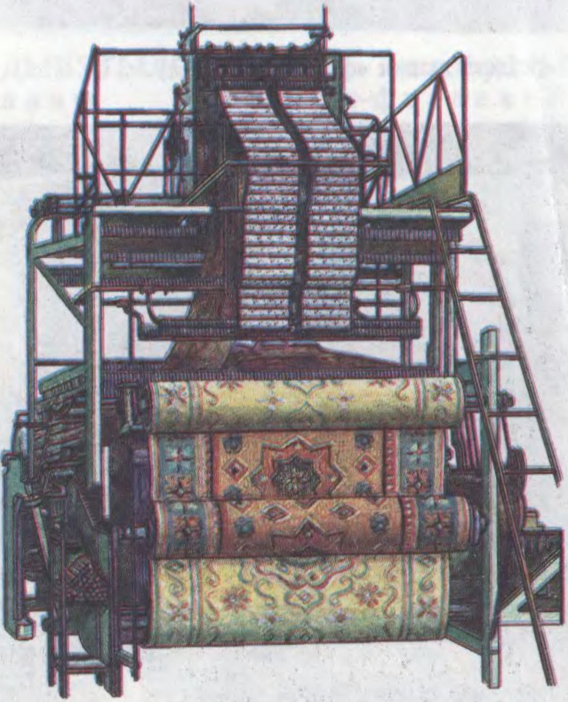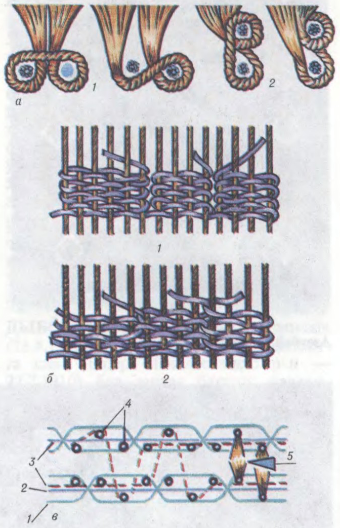 Да арт.Дыванаткацтва: а — вязка вузлоў (двайных і паўтарачных) у ручным дыванаткацтве (1 — гарызантальная, 2 — вертыкальная); б — схема перапляценняў бязворсавых дываноў (1 — палас, 2 — кілім); в — структура двухпалотных дываноў (1, 2, 3 — карэнная, насцільная і ворсавая асновы; 4 — ніткі ўтку; 5 — нож).Да арт.Дыванаткацтва. Двухпалотны дыванаткацкі станок з машынай Жакарда.