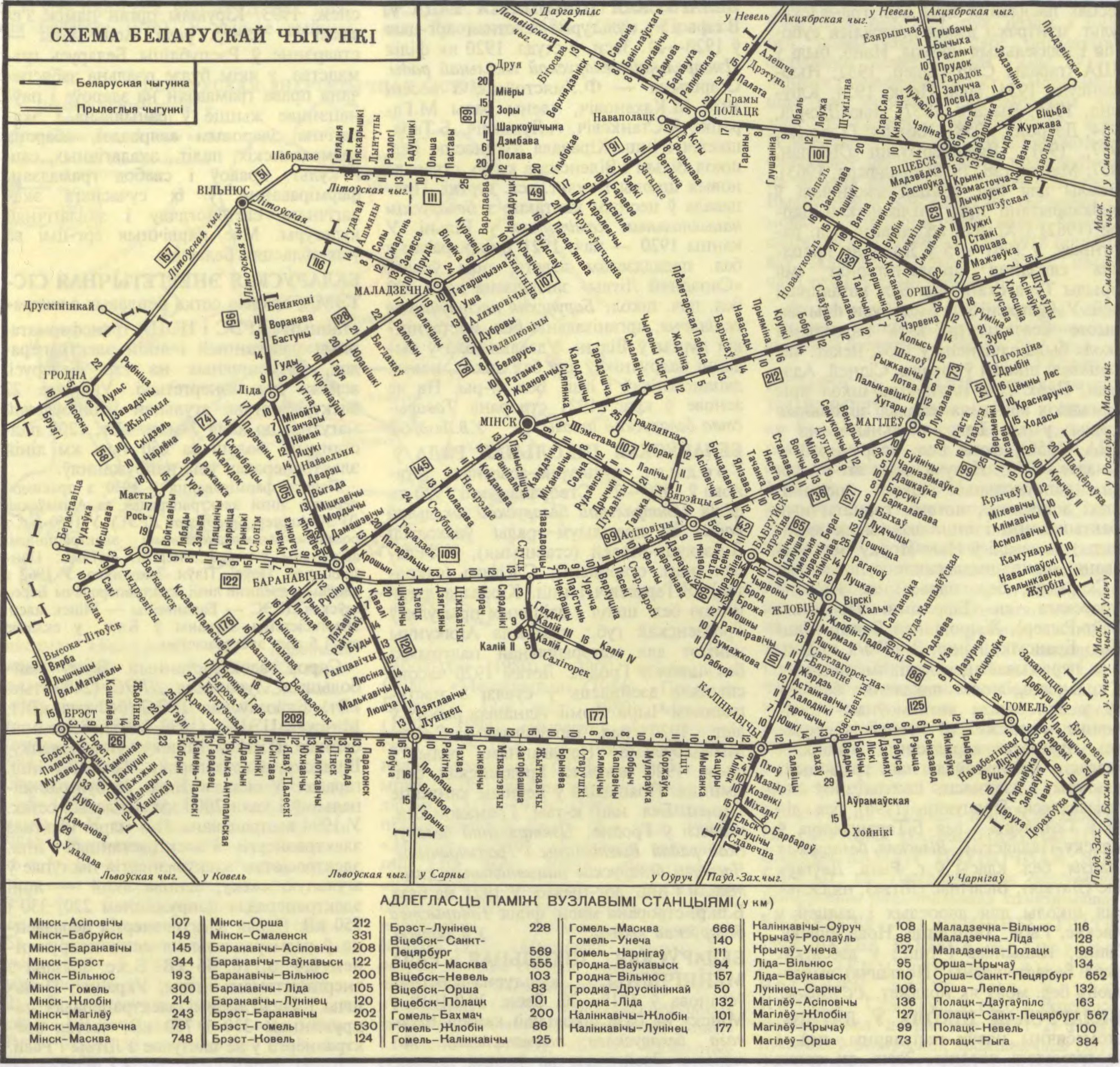 Шчыльнасць чыг. сеткі Беларусі больш за 26 км на 1 тыс. км². У складзе беларускай чыгункі 6 аддзяленняў (Баранавіцкае, Брэсцкае, Віцебскае, Гомельскае, Магілёўскае, Мінскае), больш як 400 станцый, 9 дэпо па рамонце вагонаў, 17 дэпо па рамонце лакаматываў і інш. прадпрыемствы. Парк грузавых вагонаў налічвае каля 36 тыс. адзінак трансп. сродкаў, пасажырскі парк мае больш за 1 тыс. цягавых сродкаў (цеплавозы, электравозы, дызель-паязды, электрапаязды і інш.). У 1995 беларускай чыгункай перавезена 73,4 млн. т. грузаў і 147,3 млн. пасажыраў. Грузаабарот склаў 25,5 млн. т/км, пасажыраабарот — 12,5 млн. пасажыра-км. Беларуская чыгунка — чл. міжнар. Арганізацыі супрацоўніцтва чыгунак і Міжнар. саюза чыгунак. Гл. схему.