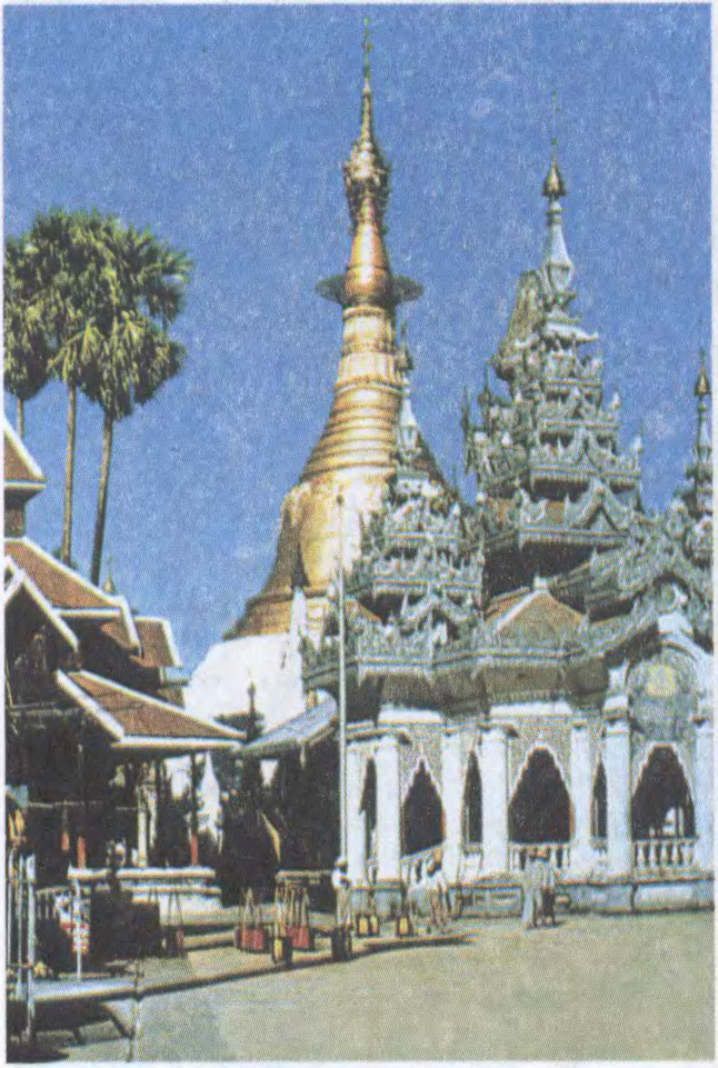 Герб і сцяг М’янмы.Да арт.М’янма: 1 — ландшафт у цэнтральнай частцы М’янмы; 2 — ірыгацыйная сістэма Чэмоўтау.Да арт.М’янма. Пагада Шуэдагоўн (Шведагон) у Рангуне. 14 ст., неаднаразова перабудаваная да 18 ст.