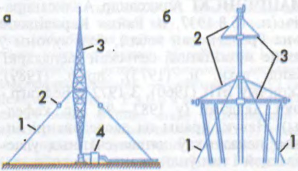 Да арт.Мачта: а — мачта-антэна (1 — адцяжка, 2 — ізалятар, 3 — мачта з высоўным стрыжнем для настройкі, 4 — узгадняльнае прыстасаванне), б — сігнальная суднавая мачта (1 — ванты, 2 — тапенанты, 3 — антэнны і сігнальны рэй).