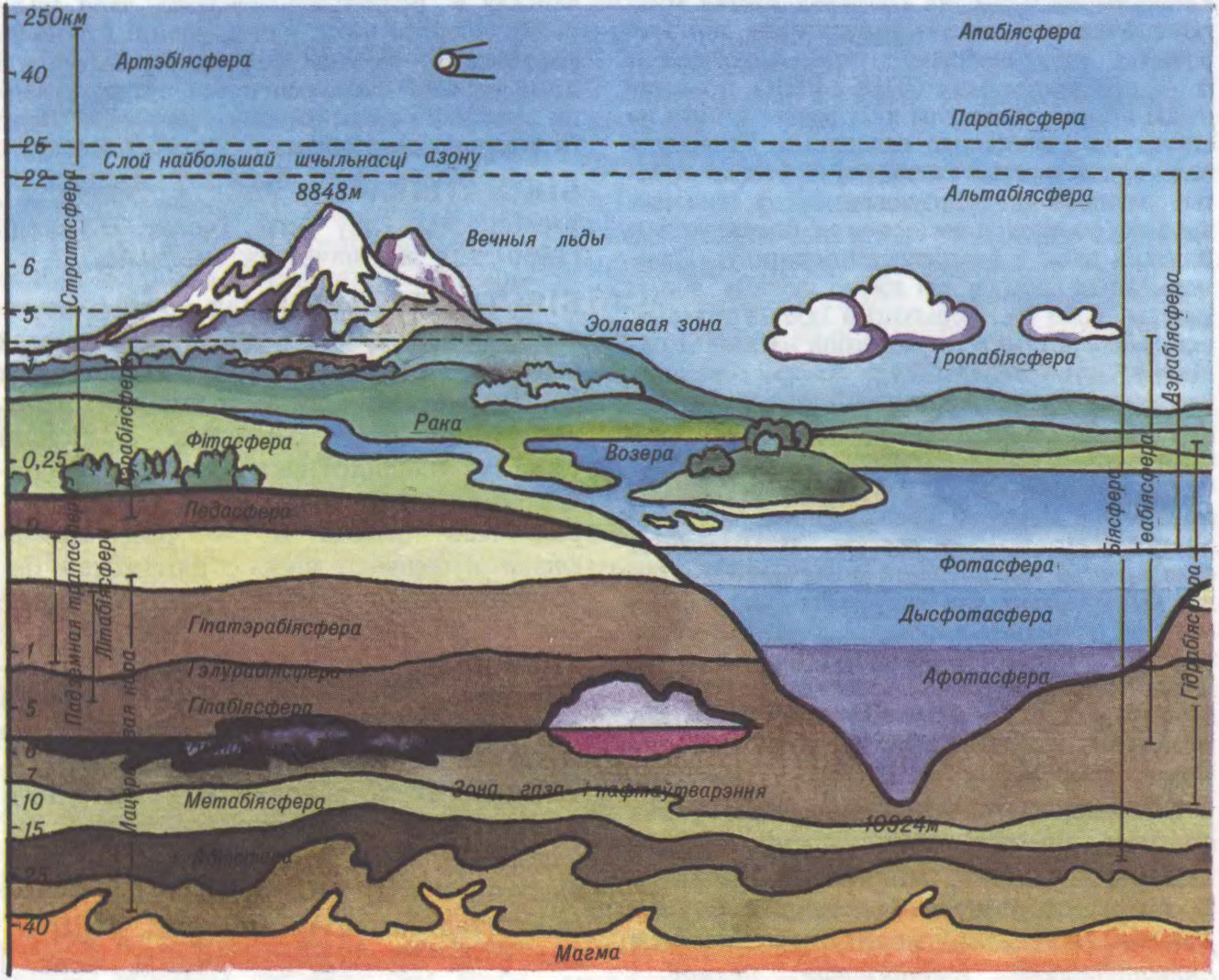абалонка Зямлі, састаў, структура і энергетыка якой абумоўлены сукупнай дзейнасцю і ўплывамі жывых арганізмаў. Першыя ўяўленні пра біясферу сфармуляваў франц. вучоны Ж.Б.Ламарк (1802). Тэрмін «біясфера» ўвёў аўстр. геолаг Э.Зюс (1875). Стварэнне цэласнага вучэння пра біясферу належыць рус. вучонаму У.І.Вярнадскаму (1926). Біясфера ўключае арганізмы (каля 3 млн. відаў), іх рэшткі, прыземную ч. атмасферы да вышыні азонавага экрана (20—30 км), усю гідрасферу і верхнюю частку літасферы; усе яны ўзаемазвязаны працэсамі міграцыі рэчыва і энергіі. Ніжняя мяжа біясферы на сушы на глыб. да 3—4 км ад паверхні зямной кары, у Сусветным ак. на 1—2 км ніжэй за дно. У біясферы (паводле Вярнадскага) адрозніваюць 7 розных, але ўзаемазвязаных тыпаў рэчываў: жывое рэчыва (расліннае, жывёльнае і мікраарганізмы), біягеннае рэчыва (прадукты жыццядзейнасці жывых арганізмаў — гаручыя выкапнёвыя, вапнякі і інш.), косныя рэчывы (горныя пароды магматычнага, неарган. паходжання, вада і інш.), біякосныя рэчывы (прадукты распаду і перапрацоўкі горных і асадкавых парод жывымі арганізмамі), радыеактыўнае рэчыва, рассеяныя атамы і рэчыва касм. паходжання (метэарыты, касм. пыл). Асн. функцыя біясферы — выкарыстанне сонечнай энергіі (фотасінтэз) і біялагічны кругаварот рэчываў і энергіі, які забяспечвае развіццё ўсіх жыццёвых працэсаў. Жывыя арганізмы (жывое рэчыва) і іх жыццёвае асяроддзе арганічна звязаны паміж сабой і ўтвараюць сістэмы глабальнага, рэгіянальнага і лакальнага ўзроўняў. У рэгіянальных і лакальных сістэмах вылучаюць структурныя адзінкі біясферы: біёмы, біягеацэнозы (экасістэмы), прыродныя зоны на раўнінах і вышынныя (вертыкальныя) прыродныя паясы ў гарах. Біясфера мазаічная паводле структуры і саставу адлюстроўвае геахім. і геафіз. неаднароднасць аблічча Зямлі (мацерыкі і акіяны, прыродныя зоны і паясы, раўніны і горы і інш.) і нераўнамернасць у размеркаванні жывога рэчыва. Больш за 90% усяго жывога рэчыва біясферы прыпадае на наземную расліннасць. Агульная маса жывога рэчыва ў Б. ацэньваецца ў 1,8—2,5∙1012т (у пераліку на сухое рэчыва) і складае нязначную ч. масы біясферы (3∙1018т). На стан біясферы моцна ўплывае гасп. дзейнасць чалавека. Антрапагеннае ўздзеянне стымулюе пераход біясферы ў якасна новы стан — наасферу. Ахова біясферы прадугледжвае сістэму мерапрыемстваў: вядзенне біясфернага маніторынгу, арганізацыю біясферных запаведнікаў і інш., накіраваных на захаванне арганізмаў і біягеацэнозаў. Праводзіцца комплексная міжнар. праграма «Чалавек і біясфера». Гл. таксама Ахова прыроды, Забруджванне навакольнага асяроддзя.