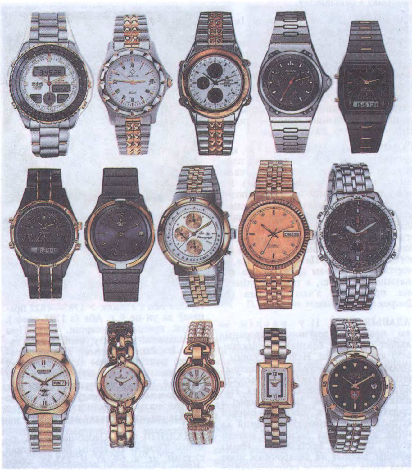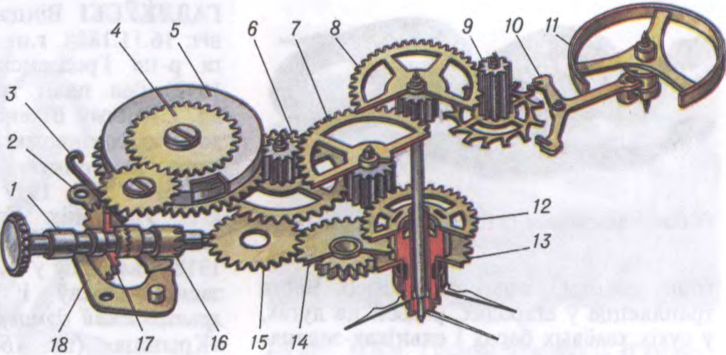 Узоры сучасных (2-я пал. 1990-х г.) наручных гадзіннікаў.Старажытныя гадзіннікі: а — экватарыяльны сонечны; б — гарызантальны сонечны; в — агнявы, з гаручай спіраллю; г — агнявы масляны (час вызначаўся па ўзроўні масла); д — вадзяны, або клепсідра (1 — паплавок, 2 — лейка з вадой, 3 — стопар для рэгулявання патоку вады); е — камплект з чатырох пясочных гадзіннікаў.Схема сучаснага наручнага механічнага гадзінніка: 1 — завадны вал; 2 — завадны рычаг; 3 — спружына заваднога рычага; 4, 6, 7, 8, 9 — колы (барабаннае, псеўдацэнтральнае, прамежкавае, секунднае, анкернае); 5 — барабан са спружынай; 10 — анкерная вілка; 11 — балансір; 12, 13, 14, 15 — колы (фрыкцыйнае, гадзіннае, вэксальнае, пераводнае); 16 — муфта; 17 — завадны трыб; 18 — пераводны рычаг.