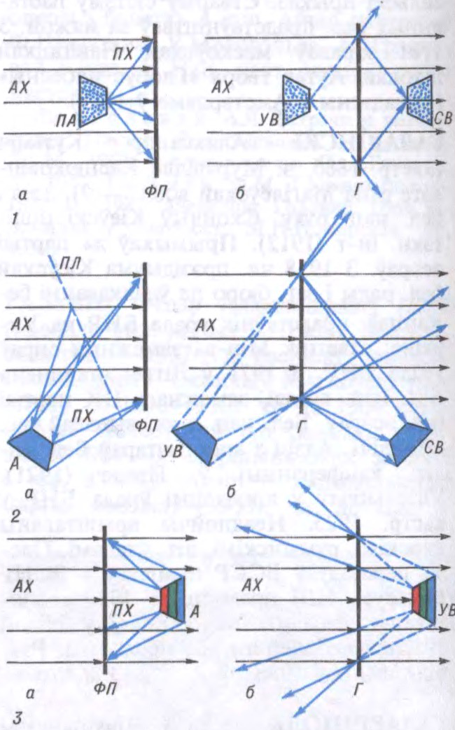 Да арт. Галаграфія. Схемы атрымання галаграм (а) і ўзнаўлення відарысаў (б): 1 — схема Габара; 2 — схема Лэйтса—Упатніекса; 3 — схема Дзенісюка; АХ — апорная хваля; ПА — паўпразрысты аб’ект; ПХ — прадметная хваля; ФП — фотапласцінка; Г — галаграма; СВ — сапраўдны відарыс; А — адбівальны аб’ект; ПЛ — паўпразрыстае люстэрка; УВ — уяўны відарыс.