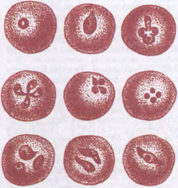 Даўж. 0,7—2 мкм. Форма акруглая ці грушападобная. Бясколерныя, з адзіночнымі храмацінавымі ўключэннямі. У адным эрытрацыце 1—4 (да 10) паразіты. Размнажэнне (бясполае) простым ці множным дзяленнем (шызаганія), у эрытрацытах — часта на 4 клеткі (размяшчэнне ў форме мальтыйскага крыжа).