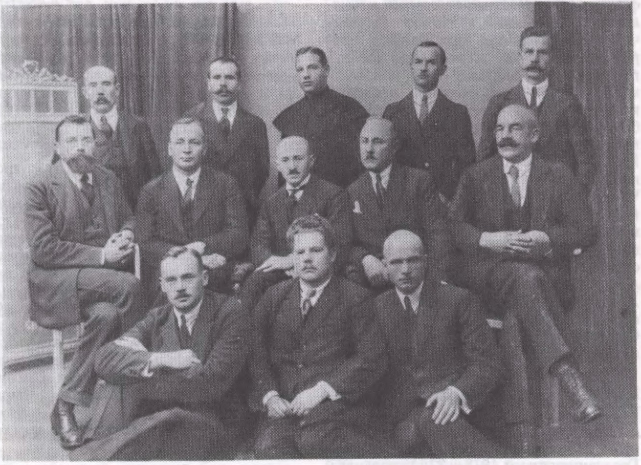 Беларускі пасольскі клуб. Сядзяць (злева направа): у 1-м радзе — А.Аўсянік, Ф.Ярэміч, П.Валошын; у 2-м радзе — В.Багдановіч, М.Кахановіч, Б.Тарашкевіч, А.Назарэўскі, А.Уласаў; стаяць: В.Рагуля, С.Якавюк, А.Станкевіч, С.Рак-Міхайлоўскі, П.Мятла. Варшава. 1923.
