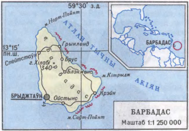 дзяржава на аднайм. востраве ў Вест-Індыі, у групе Малых Антыльскіх а-воў, у Атлантычным ак. Падзяляецца на 11 акруг. Пл. 431 км². Нас. 300 тыс.чал. (1994). Сталіца — г.Брыджтаўн. Афіц. мова — англійская. Нац. свята — Дзень незалежнасці (30 ліст.).