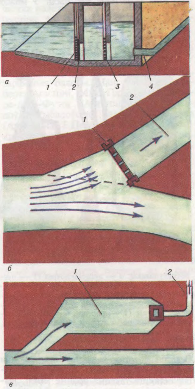 Схемы водазаборных збудаванняў: а — галаўнога берагавога (1 — рашотка для затрымкі смецця, 2 — засаўка, 3 — рыбазагараджальнік, 4 — усмоктвальная труба); б — бесплаціннага паверхневага берагавога (1 — рэгулятар з засаўкамі, 2 — канал); в — бесплаціннага паверхневага каўшовага (1 — коўш, 2 — трубаправод).