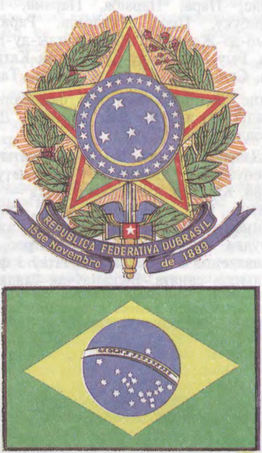Герб і сцяг Бразіліі.Да арт.Бразілія. Узбярэжжа заліва Рыо-дэ-Жанейра.Да арт.Бразілія. Вадаспад Ігуасу на р. Парана.Да арт.Бразілія. К.Партынары. Збор кавы. 1935. Фрагмент.Да арт.Бразілія. Статуя Хрыста на вяршыні ўзгорка Каркаваду ў Рыо-дэ-Жанейра. Скульптар П.Ландоўскі. 1931.Да арт.Бразілія. Царква Сан-Франсіску ў Ору-Прэту. Арх. і скульптар Алейжадынью. 1766—94.Да арт.Бразілія. Вуліца 9 Ліпеня ў Сан-Паўлу.Да арт.Бразілія. Падрыхтоўка саджанцаў кававых дрэў да пасадкі.Да арт.Бразілія. Інтэр’ер кафедральнага сабора ў г. Бразілія. Арх. О.Німеер. 1960.Да арт.Бразілія. Адміністрацыйныя і грамадскія будынкі. Арх. О.Німеер. 1957—60.