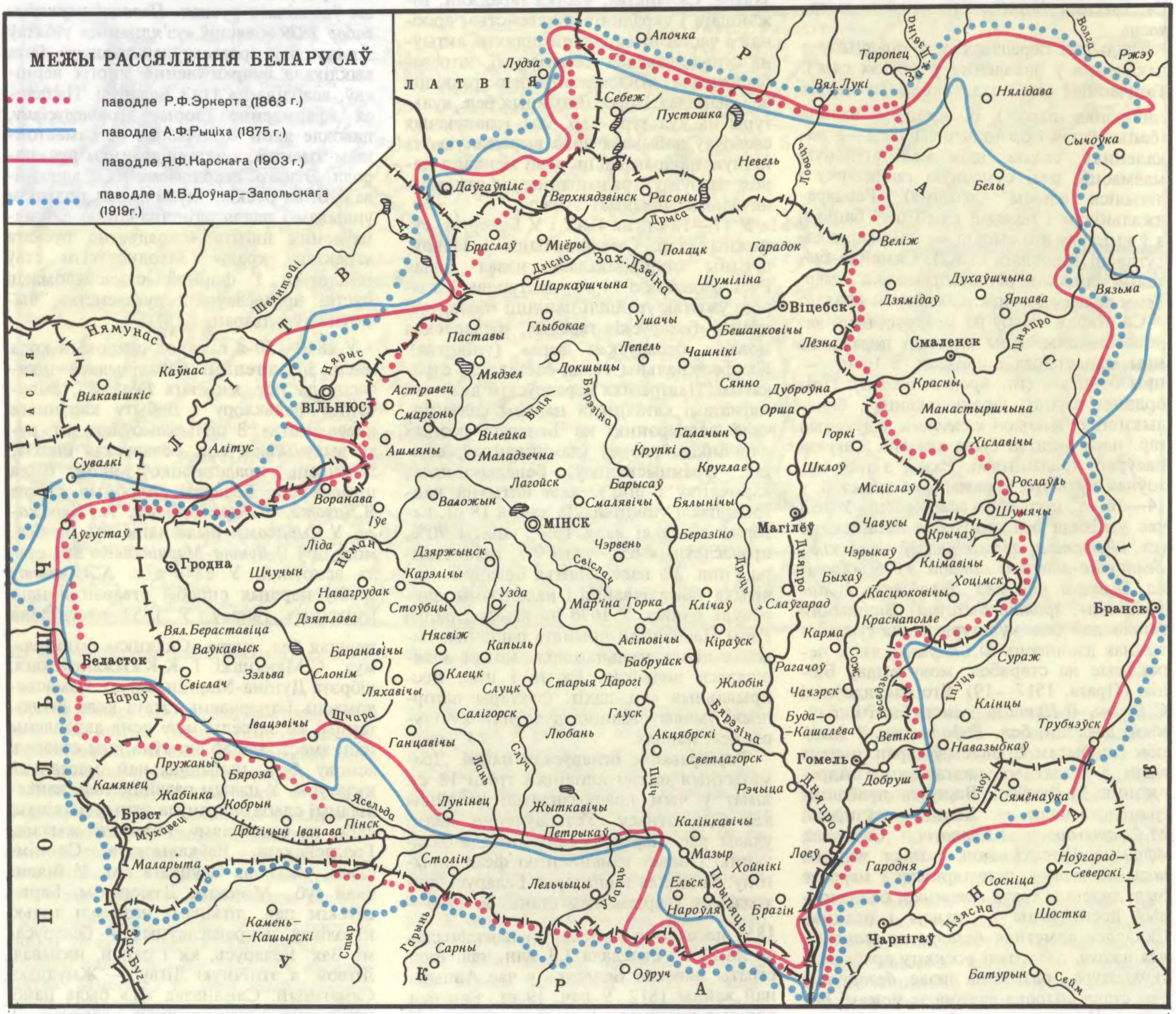 Фарміраванне беларускай нацыі. Драматычныя падзеі апошняй трэці 18 ст. шмат у чым прадвызначылі далейшы лёс бел. этнасу. Устанаўленне паліт. улады рас. царызму садзейнічала захаванню і нават узмацненню феад. прыгону. Сельская гаспадарка Беларусі знаходзілася ў крызісным стане. За 1796—1858 насельніцтва Беларусі павялічылася на 27% і складала 3,3 млн.чал.Вял. страты панесла Беларусь у час Айчыннай вайны 1812. У пач. 19 ст. з’явіліся першыя прыкметы нац. кансалідацыі. У Віленскім ун-це ў канцы 1810-х г. М.Баброўскі і І.Даніловіч паклалі пачатак збіранню і публікацыі помнікаў бел. пісьменства 16—17 ст., садзейнічалі абуджэнню цікавасці да гіст. мінулага сярод студэнтаў — сяброў таварыстваў філаматаў і філарэтаў.