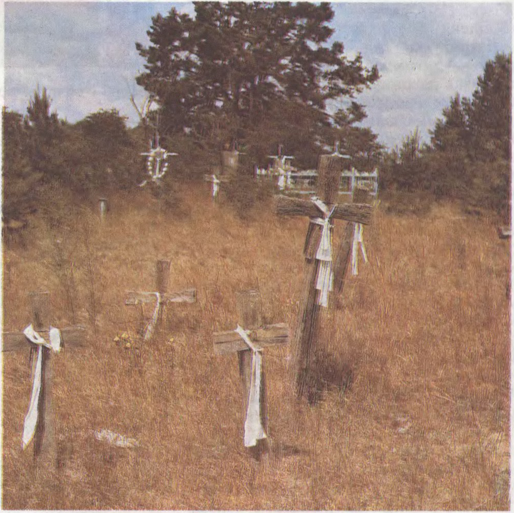 Беларускі дзяржаўны музей народнай архітэктуры і побыту. Экспазіцыя сектара «Цэнтральная Беларусь».Крыжы з аброчнымі тканінамі на могілках у Чарнобыльскай зоне.
