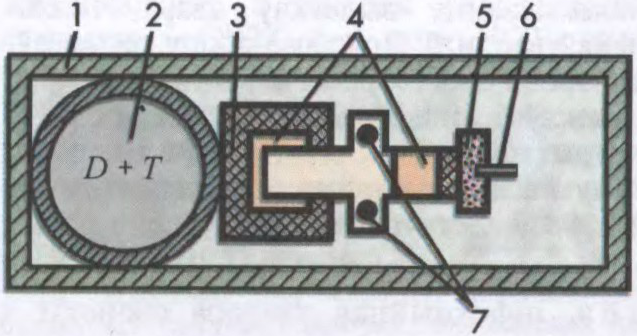 Да арт.Нейтронныя боепрыпасы. Схема нейтроннага снарада «пушачнага» тыпу: 1 — корпус з сістэмай утрымання плазмы ў зоне рэакцыі; 2 — сумесь дэйтэрыю і трытыю; 3 — адбівальнік нейтронаў; 4 — зарад плутонію 239; 5 — зарад выбуховага рэчыва; 6 — дэтанатар; 7 — крыніца нейтронаў.