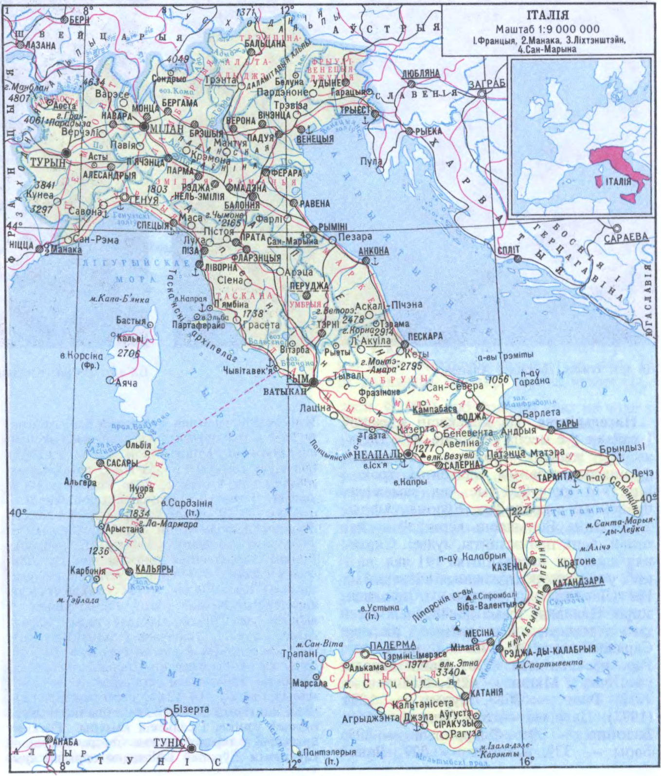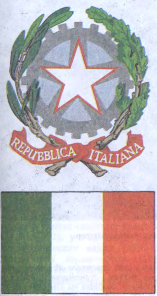 Герб і сцяг Італіі.Да арт.Італія. Даліна ў Альпах.Да арт.Італія. Краявід на схілах Апенінскіх гор.Да арт.Італія. Порт Неапаль.Да арт.Італія. Сельскагаспадарчыя ўгоддзі ў сярэдняй частцы краіны.Да арт.Італія. Уступленне ў Неапаль Дж.Гарыбальдзі 7.9.1860. Тагачасны малюнак.Да арт.Італія. Жыхары Мілана вітаюць войскі ЗША. Красавік 1945.Да арт.Італія. Панарама Фларэнцыі.Да арт.Італія. Сабор святога Пятра ў Рыме. 1506—1614.Да арт.Італія. Сабор у Арвіета. 1290—1569.Да арт.Італія. Царква Санта-Марыя Навела ў Фларэнцыі. Каля 1278—1360.Да арт.Італія. Іспанская лесвіца на П’яцца ды Спанья ў Рыме.Да арт.Італія. Андрэа ды Бартала. Іаакім пакідае горад. Дрэва, тэмпера.Да арт.Італія. С.Марціні. Благавешчанне. 1333.Да арт.Італія. «Палажэнне ў труну». Вітраж па кардоне А. дэль Кастаньё. Сабор Санта-Марыя дэль Ф’ёрэ. 1443—14.Да арт.Італія. Антоніо дэль Палаёла. Бітва дзесяцярых аголеных. Разцовая гравюра. 1740.Да арт.Італія. Мікеланджэла. Грабніца Ларэнца Медычы. Каля 1524—31.Да арт.Італія. А.Салдаці. Аналогіі. 1950.Да арт.Італія. Р.Гутуза. Акно ў Рыяна Фламініо. 1951.Да арт.Італія. Дж.Марандзі. Нацюрморт. 1962.Да арт.Італія. Ф.Месіна. Вялікая танцоўшчыца. 1979.Да арт.Італія. Дж.Манцу. Смерць гвалтоўная. Эскіз рэльефу для «Брамы смерці» сабора св. Пятра ў Рыме. 1949—64.Да арт.Італія. Джавані ды Паала. Выгнанне з раю. Каля 1440.Да арт.Італія. Рафаэль. Заручыны Марыі. 1504.Да арт.Італія. Венецыянскі майстар. Кубак са сцэнай пакланення вешчуноў. Шкло. 1465.Да арт.Італія. Глядзельная зала тэатра «Ла Скала». Пач. 19 ст.