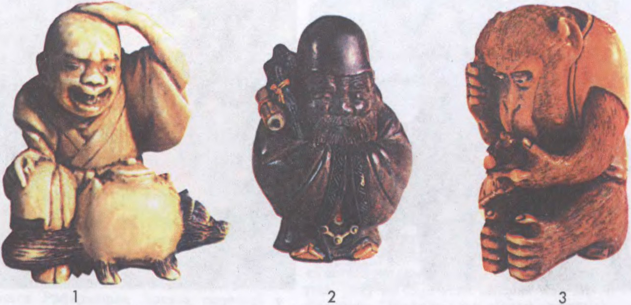 Нэцкэ: 1 — Чароўны кацялок для чаю; 2 — Бог шчасця Дзюрадзін; 3 — Малпа, якая разглядвае нэцкэ ў выглядзе малпы з персікам. 19 ст.