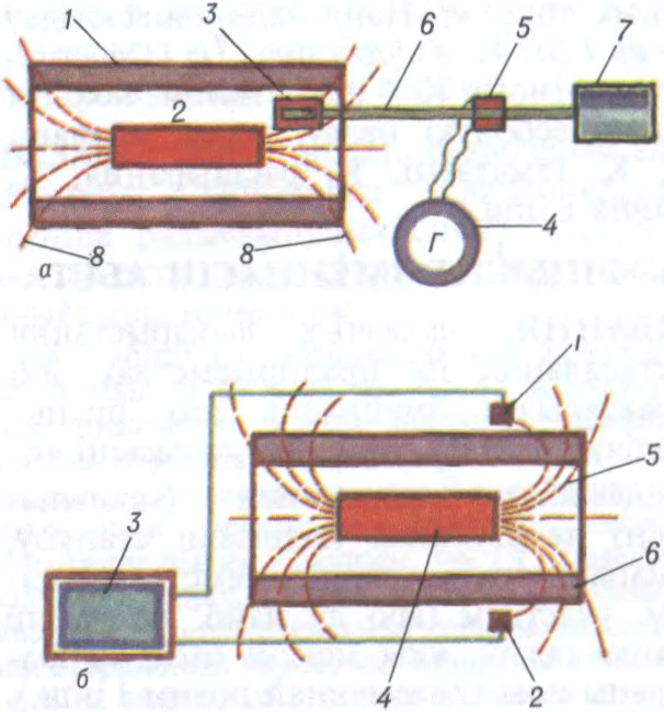 Блок-схемы каэрцытыметраў: а — з вымяральным генератарам (1 — намагнічвальная шпуля; 2 — узор; 3 — шпуля вымяральнага генератара; 4 — гальванометр, далучаны да калектара 5; 6 — вал электрарухавіка 7; 8 — сілавыя лініі магнітнага поля ўзору); б — феразондавага (1, 2 — адчувальныя элементы; 9 — нулявая прылада; 4 — узор; 5 — сілавыя лініі магнітнага поля ўзору, 6 — намагнічвальная шпуля).