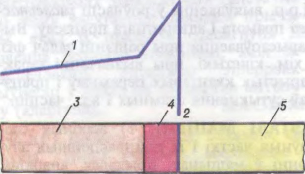 Да арт. Дэтанацыя. Схема дэтанацыйнай хвалі: 1 — размеркаванне ціску ў хвалі; 2 — фронт ударнай хвалі; 3 — прадукты хімічнай рэакцыі; 4 — зона хімічнай рэакцыі; 5 — выбуховае рэчыва.