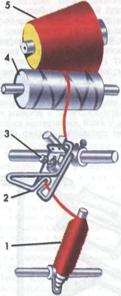 Схема матальнай машыны: 1 — нерухомае верацяно; 2 — накіравальны дроцік; 3 — нацяжное прыстасаванне; 4 — матальны барабанчык з канаўкамі для нітак (для ўтварэння крыжападобнай намоткі); 5 — бабіна.