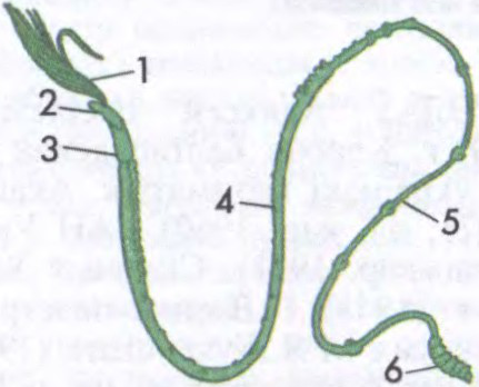 Паганафора: 1 — шчупальцы; 2 — галаўная лопасць; 3 — вуздэчка; 4 — другі аддзел цела; 5 — трэці аддзел цела; 6 — задні аддзел цела.