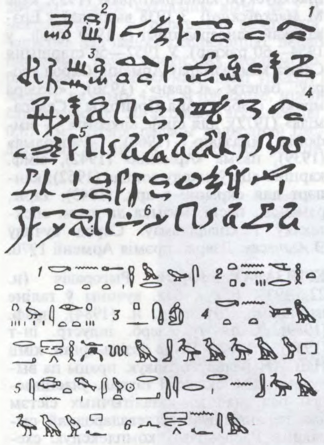 Да арт.Егіпецкае пісьмо. Узор іератычнага пісьма (зверху); той жа тэкст у іерагліфічнай перадачы.