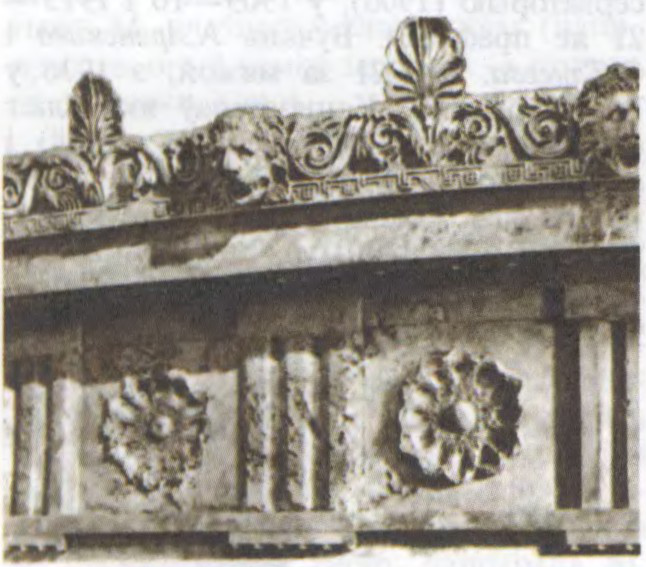 Метопы ў выглядзе разетак на фасадзе храма Асклепія ў г. Эпідаўр. 4 ст.Метопа з выявай антычнага шлема ў фрызе дома па вул. Замкавай у Гродне. 19 ст.