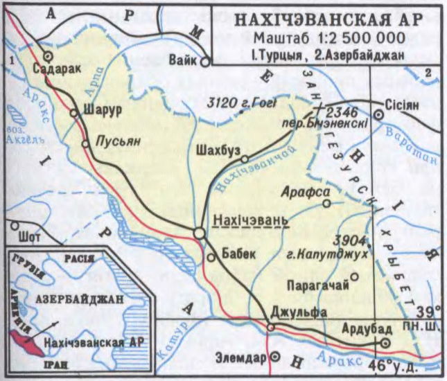 у складзе Азербайджана, аддзелена ад яго тэр. Арменіі. Мяжуе па р. Аракс з Іранам і Турцыяй. Пл. 5,5 тыс.км2. Нас. 306 тыс.чал. (1991), гарадскога 33%. Сярэдняя шчыльн. 55,6 чал. на 1 км2. Жывуць азербайджанцы (95,6%), рускія і інш. Цэнтр — г.Нахічэвань. Гарады: Ардубад, Джульфа, Шарур.