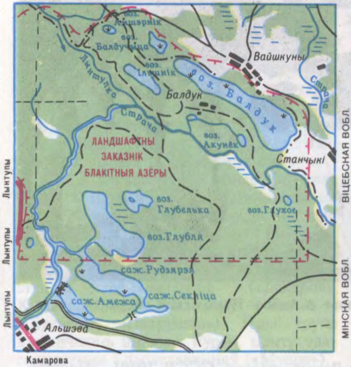у Беларусі, на мяжы Пастаўскага р-на Віцебскай вобл., Мядзельскага р-на Мінскай вобласці і Астравецкага р-на Гродзенскай вобл., на З Бел. Паазер’я, у бас. р. Страча, на тэр. ландшафтнага заказніка Блакітныя азёры. Уключае невял. азёры Балдук, Глубелька, Ячмянец, Мёртвае, Імшарац, Глубля. Агульная пл. 1,5 км².