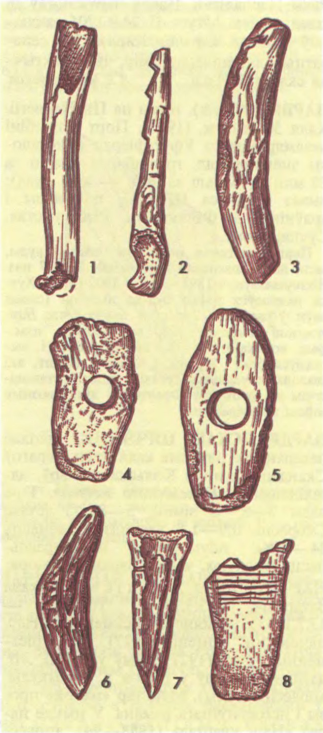 Да арт.Нарвенская культура. Касцяныя і рагавыя вырабы са стаянкі Зацэнне: 1 — абломак кінжала; 2 — гарпун; 3 — сякера; 4, 5, 8 — матыкі; 6 — цясла; 7 — прылада з трубчастай косці.