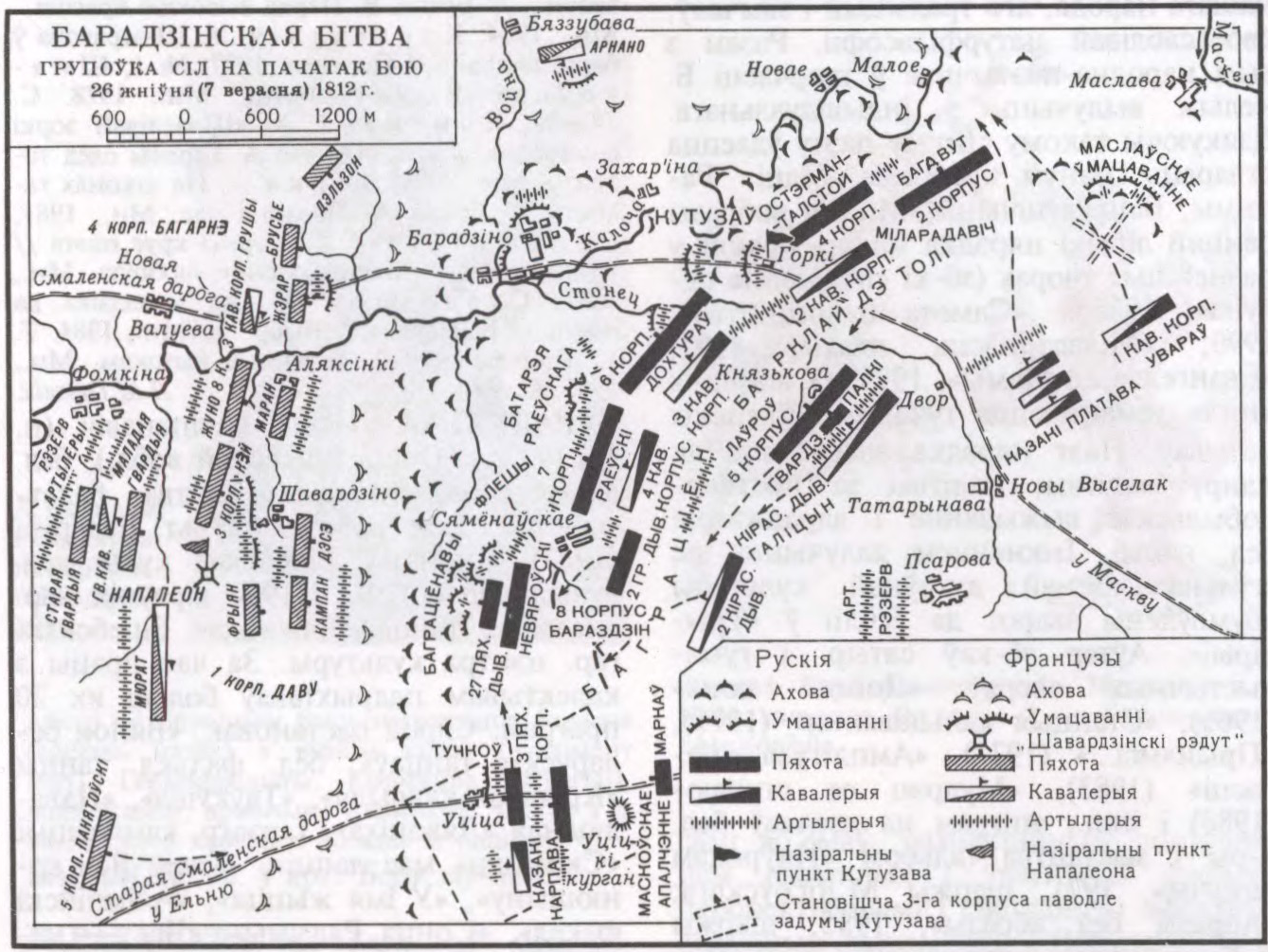 Рас. арміі — 1-я Зах. на чале з ген. М.Б.Барклаем дэ Толі і 2-я Зах. пад камандаваннем ген. П.І.Баграціёна — пасля адыходу ад Смаленска 3 вер. спыніліся каля с. Барадзіно, дзе галоўнакаманд. ген. М.І.Кутузаў вырашыў прыняць бой, каб не дапусціць праціўніка да Масквы. Пазіцыі рас. часцей (правы фланг прыкрываўся р. Калоча, цэнтр — Баграціёнавымі флешамі і размешчанай на выш. Курганная батарэяй М.М.Раеўскага, левы фланг даходзіў да в. Уціца) перакрылі Новую Смаленскую дарогу, па якой рухаліся франц. войскі на чале з галоўнакаманд. імператарам Напалеонам I. Шэсцьрас. дывізій на правым флангу і 4 дывізіі ў цэнтры падпарадкоўваліся Барклаю дэ Толі, 5 егерскіх палкоў на левым флангу — Баграціёну. 5 вер.франц. войскі (каля 40 тыс.чал., 186 гармат) пасля працяглага і цяжкага бою авалодалі перадавой рас. пазіцыяй — Шавардзінскім рэдутам, які абаранялі часці ген.-лейт. А.П.Гарчакова (12 тыс.чал., 46 гармат).