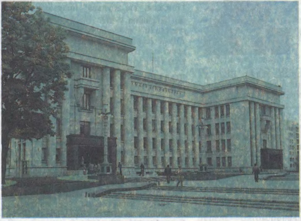 Пабудаваны ў 1934—39 (перабудова сабора б. архірэйскага падвор’я; арх. І.Лангбард). Для яго архітэктуры характэрны лаканізм і прастата кампазіцыйнай пабудовы. Гал. фасад арыентаваны на цэнтр. сквер. Трохчвэртныя калоны на вышыню 4 паверхаў падтрымліваюць велічны атык. У афармленні інтэр’ераў выкарыстаны сродкіманум.-дэкар. мастацтва (барэльефы на партале сцэны, асвятляльных галерэях, у фае, плавальным басейне; скульпт. А.Бембель, А.Глебаў і інш.). У 1974 рэканструяваны інтэр’еры тэатральнай часткі (аўтарскі калектыў пад кіраўніцтвам арх. Г.Сысоева).