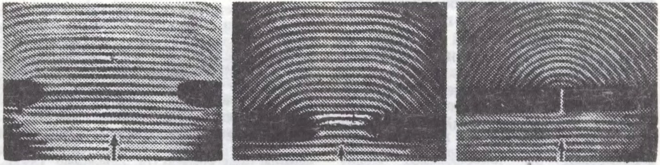 Да арт. Дыфракцыя хваль. Праходжанне плоскай гукавой хвалі праз адтуліны розных памераў.