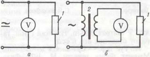Схема ўключэння вальтметра V у ланцуг: а — паралельна нагрузцы 1; б — праз транс-фарматар напружання 2.