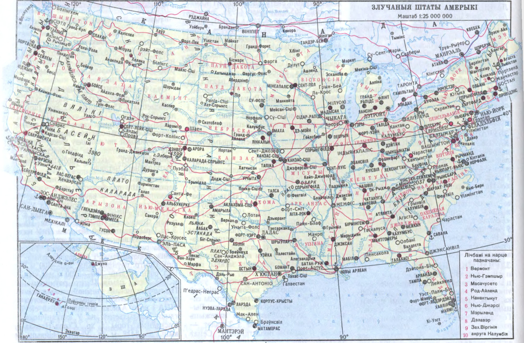 БЕЛАРУ́СЬ , Рэспубліка Беларусь, дзяржава ў цэнтры Еўропы, на З Усх.-Еўрап. раўніны. Мяжуе на ПнЗ з Літвой, на Пн з Латвіяй, на ПнУ і У з Расіяй, на Пд з Украінай, на З з Польшчай (даўж. граніц 2969 км). Працягласць з Пн на Пд 560 км, з З на У 650 км. Пл. 207,6 тыс. км². Нас. 10,3 млн. чал. (1996), гарадскога 7,1 млн. чал., сельскага 3,2 млн. чал. Дзяржаўная мова (паводле Канстытуцыі 1994) — беларуская. Па выніках рэферэндуму 1995 рускай мове нададзены роўны статус з беларускай. Грашовая адзінка — рубель (разліковы білет Нац. банка Беларусі). У Беларусі (1996) 6 абласцей: Брэсцкая вобласць, Віцебская вобласць, Гомельская вобласць, Гродзенская вобласць, Магілёўская вобласць, Мінская вобласць; 118 раёнаў, 102 гарады, 109 пасёлкаў гар. тыпу, 24 583 сельскія нас. пункты. Сталіца — г. Мінск. Нац. свята — Дзень Рэспублікі (3 ліпеня).