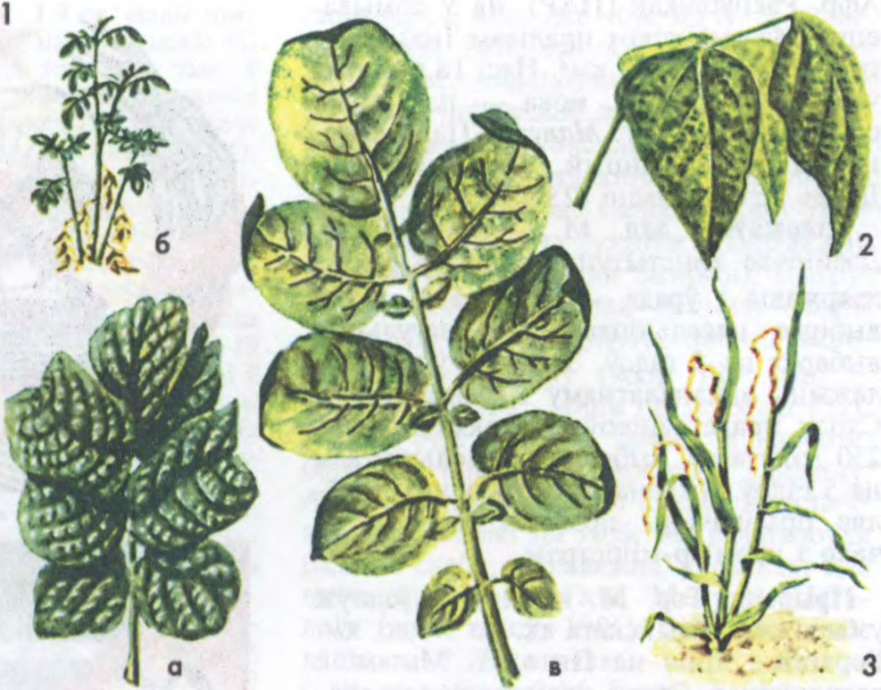 Мазаічныя хваробы раслін: 1 — маршчыністая мазаіка бульбы (а — пашкоджаны ліст, б — расліна, в — некроз жылак); 2 — жоўтая мазаіка фасолі; 3 — мазаіка азімай пшаніцы.