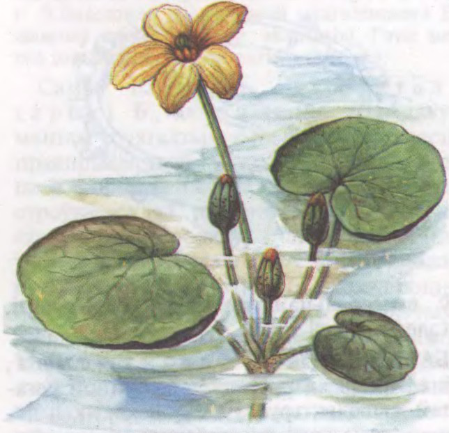 Шматгадовая травяністая расліна з паўзучым членістым карэнішчам, даўж. да 1,5 м. Сцёблы доўгія, дасягаюць паверхні вады. Лісце акругла-эліпсоіднае, на доўгіх чаранках, шчыльнае, скурыстае, знізу густа ўкрытае цёмнымі залозістымі плямкамі, плавае на вадзе. Кветкі ярка-жоўтыя, на доўгіх кветаносах, у пазушных парасонападобных пучках. Плод — яйцападобная каробачка. Дэкар., кармавая і харч. (як агародніна) расліна, прыдатная на аквакультуру.