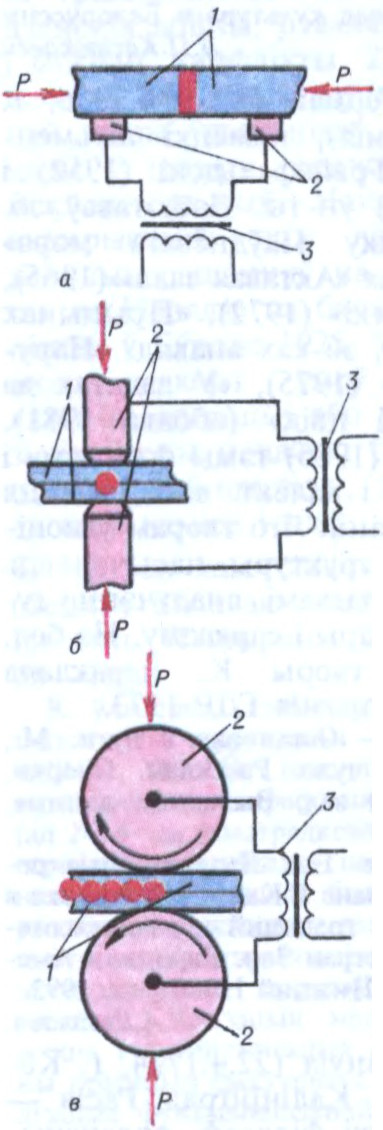 Схемы кантактавай зваркі: а — стыкавой; б — кропкавай; в — шыўнай (ролікавай); 1 — дэталі, якія зварваюцца; 2 — электроды; 3 — зварачны трансфарматар; P — сіла, што сціскае дэталі.