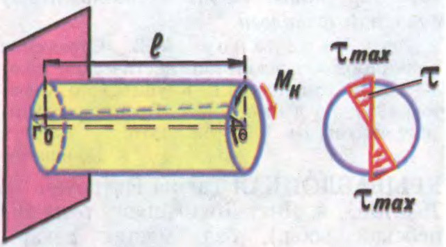 Кручэнне круглага вала, замацаванага адным канцом: r — радыус вала; l — даўжыня; Θ — вугал закручвання; Мк — момант кручэння; τmax — найбольшыя датычныя напружанні.