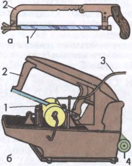 Нажоўкі: а — ручная слясарная (1 — нажовачнае палатно, 2 — рамка); б — прывадная (1 — заціскныя ціскі, 2 — рама з нажовачным палатном, 3 — трубка з ахаладжальнай вадкасцю, 4 — электрарухавік).