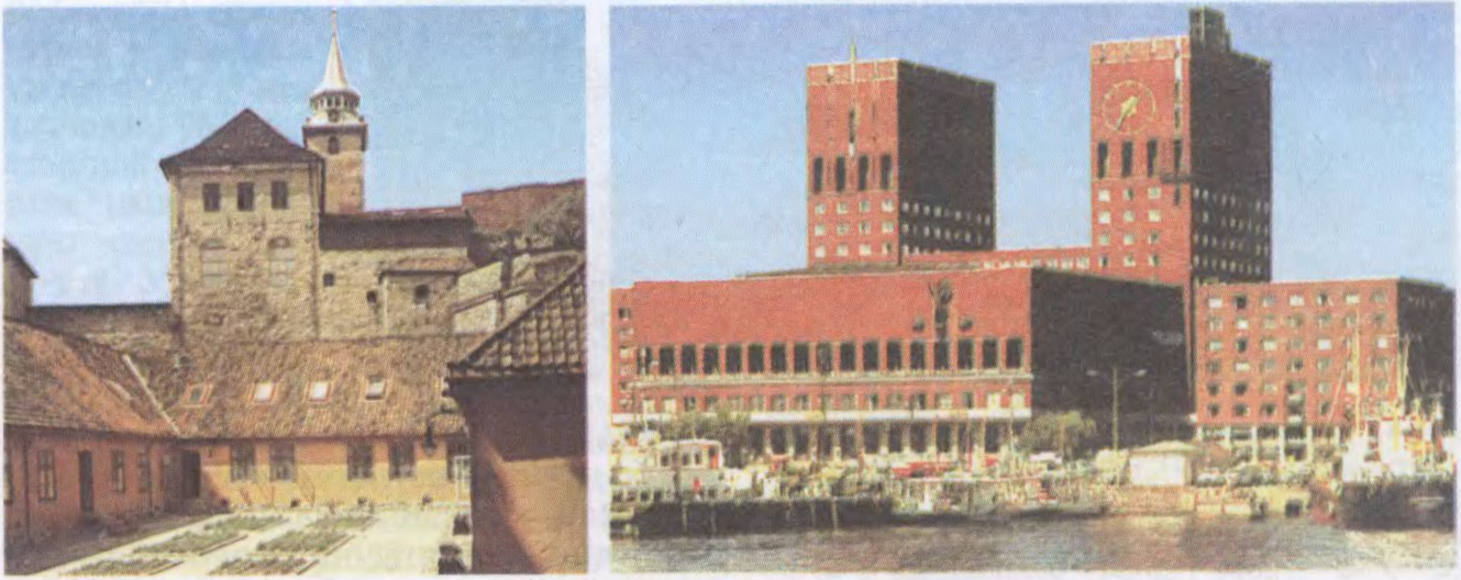 Осла. Крэпасць Акерсхус, 14—16 ст. (злева); ратуша, 1933—50, арх. А.Арнеберг, М.Поўльсан (справа). Месца правядзення VI зімовых Алімпійскіх гульняў (1952).Осла. Горад і порт.