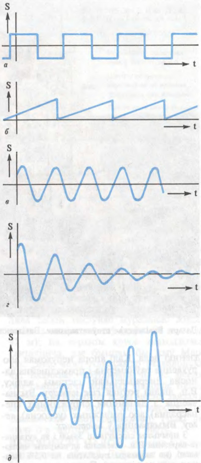 Віды ваганняў: а — прамавугольныя; б — пілападобныя; в — гарманічныя; г — затухальныя; д — нарастальныя.