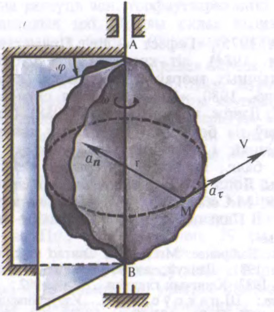 Вярчальны рух цвёрдага цела: φ — вугал павароту; ω — вуглавая скорасць; an — нар-мальнае паскарэнне; aτ — тангенцыяльнае паскарэнне; V — скорасць пункта M, што знаходзіцца на адлегласці r ад нерухомай восі AB.
